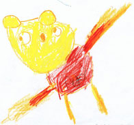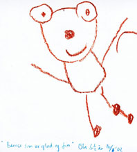 Se hvor glad denne bamsen er! Den tegnet jeg da jeg var 3,5 år (16. august 2002). Mamma og pappa sa at de synest den var så fin at de måtte ha den på siden min. | |