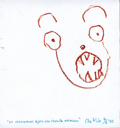 He - he... Ble du skremt nå? Jeg kan tegne sinte bamser også, sånn som denne. Egentlig er den ikke SÅ sint, bare litt. Idag (16. august 2002) har jeg tegnet så mange tegninger. Ikke rart jeg måtte legge meg tidlig. | |