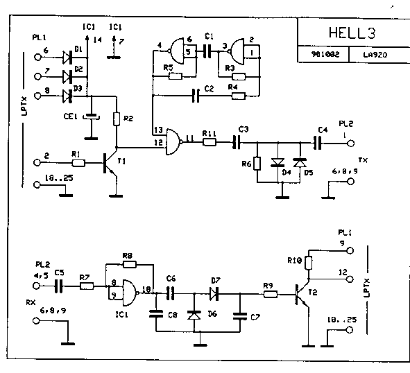 Hele konstruksjonen er oppbygd rundt en CMOS krets 4011 som inneholder fire porter. To av dem (de med pinnenr 1 til 6) danner en oscillator som svinger kontinuerlig på ca 2 kHz Når senderen skal moduleres (ved sending av Hell eller CW) legges pinne 2 i parallellporten lav, T1 slutter å lede og den tredje porten (pinnenr. 11 til 13) slipper oscillatorsignalet igjennom. Utgangsnetverket (C3, R6, D4, D5) sørger for å fjerne DC-komponenten. Signalet tilføres senderens mikrofoninngmg via C4.