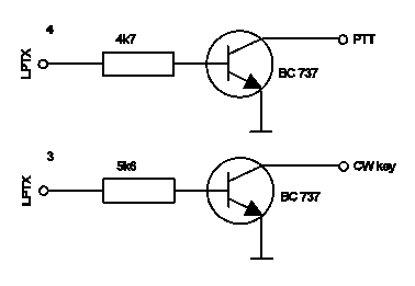 Etter råd fra LA0BX har jeg lagt inn to transistorer for å styre CW og PTT. Figuren viser saken: